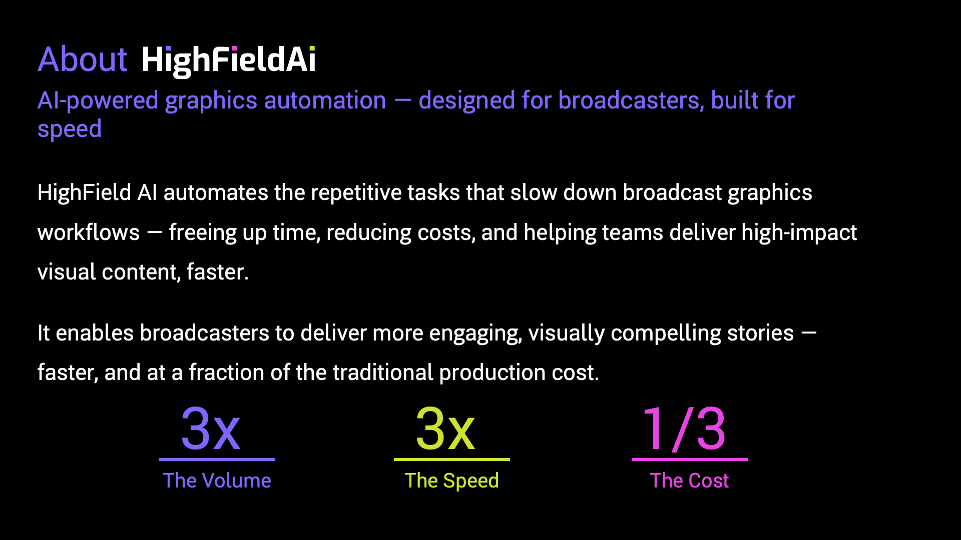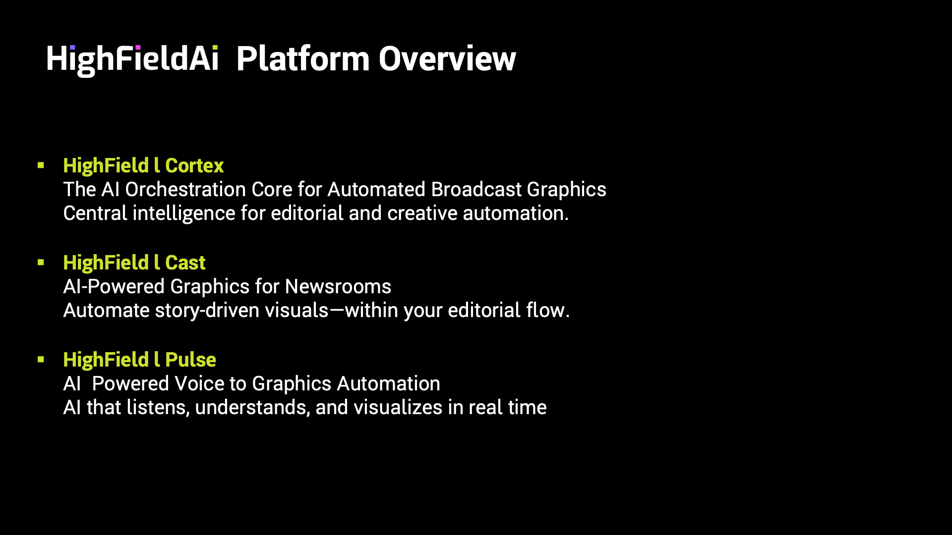 - La plateforme HighField ne vient pas perturber le workflow existant d'un diffuseur, elle le renforce grâce à l'IA et vient assister les équipes éditoriales dans la préparation des éléments graphiques à diffuser.